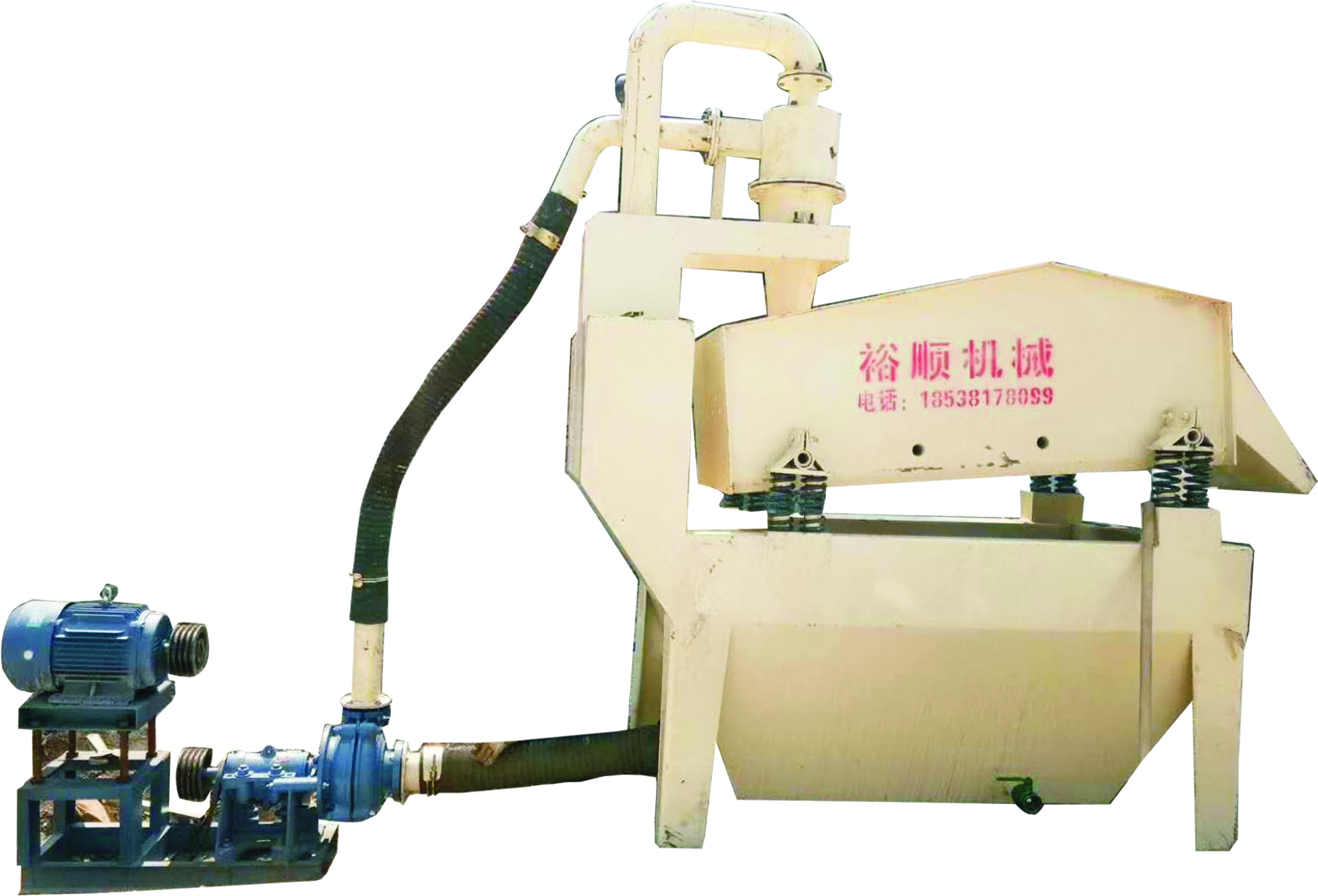 成熟的細(xì)砂回收機(jī)都使用的是振動(dòng)電機(jī)進(jìn)行直線脫水,其振動(dòng)頻率一般可達(dá)1500-300次,完全可以達(dá)到振動(dòng)脫水和下料效果,若在尾礦回收階段使用,則只需改變振動(dòng)電機(jī)安裝方向便可,與振動(dòng)篩平行安裝,便會(huì)增加回收尾礦的下料速度。